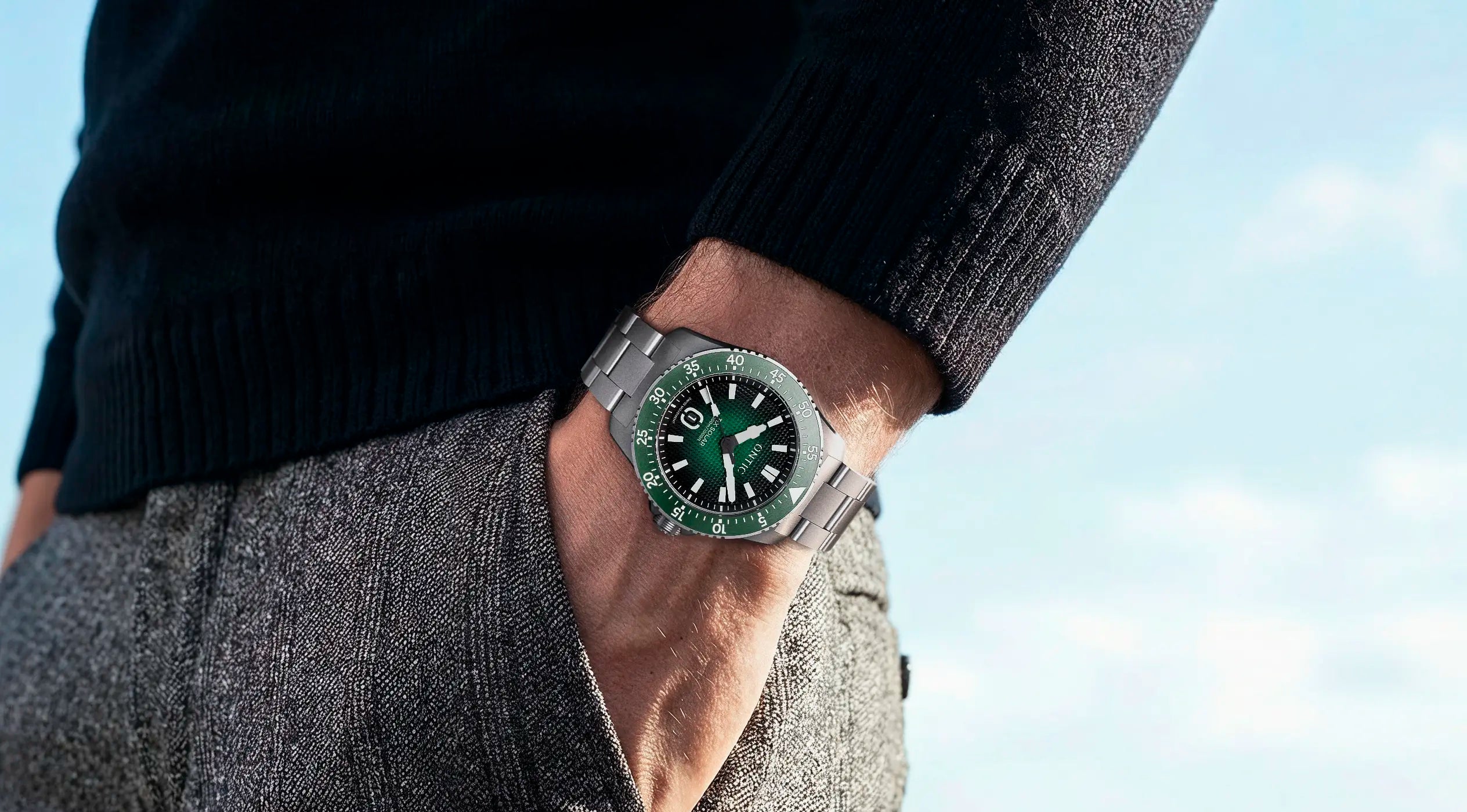 The heart of the UTILITY 40 is a Swiss solar-quartz movement. It charges from any light, runs for months in the dark, and keeps time to within seconds a month. No winding, no charging, no babysitting. It just gets on it.