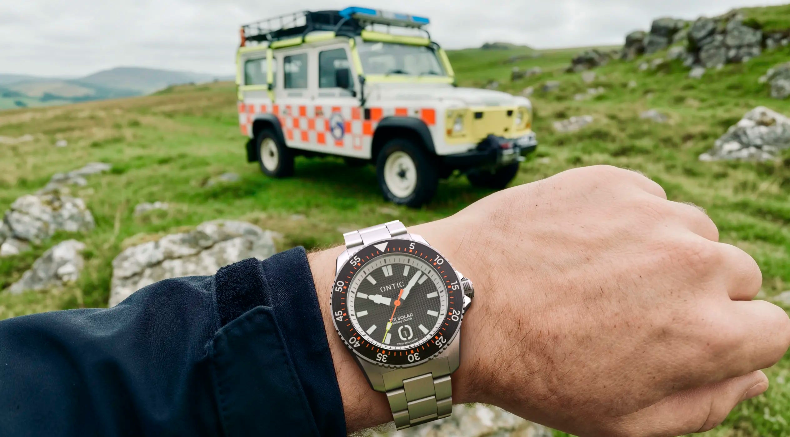 So the MR1 is built the same way. TiX titanium (hardened to 1200HV). Swiss Solar movement. High contrast dial. 300 metre water resistance. Everything on it earns its place, including the bright orange and yellow accents which are inspired by the livery of UK Mountain Rescue vehicles.